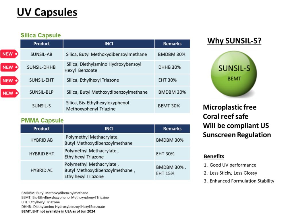 세번째로, Silica UV Capsule 시리즈를 새롭게 런칭하였습니다. 네 종류의 유기 자외선 차단제를 실리카에 담지시켜 수상에 쉽게 적용할 수 있도록 설계된 SUNSIL-S, SUNSIL-AB, SUNSIL-DHHB, SUNSIL-EHT는 가벼운 사용감과 자외선 차단 효과를 동시에 제공합니다. SUNSIL-BLP는 블루라이트 차단 효과를 갖춘 혁신적인 제품입니다.
