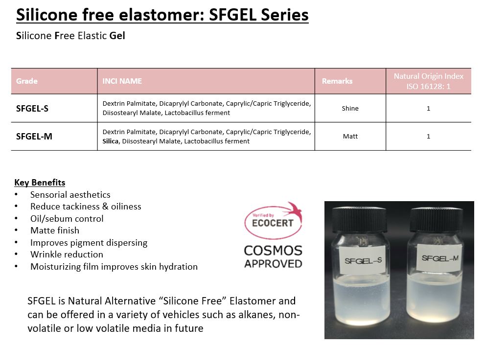 첫번째 제품인 SFGEL 시리즈란? 클린뷰티 컨셉의 천연 엘라스토머 신제품으로, 다양한 유화 제품에 고급스러운 사용감을 나타낼 수 있는 실리콘 프리 컨셉의 제품 입니다.