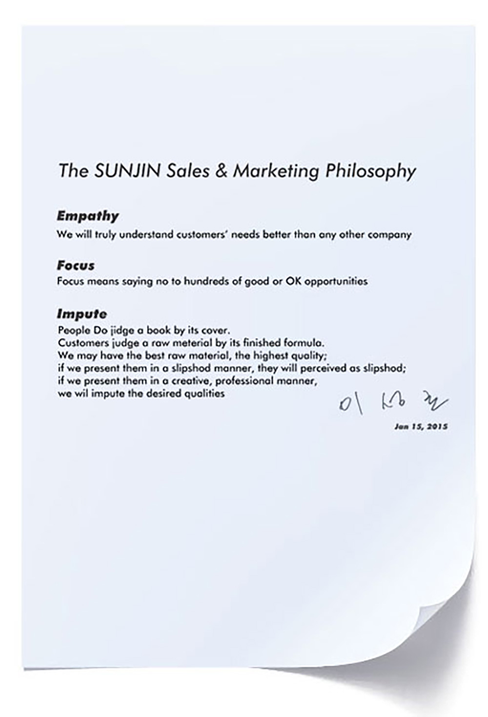 애플의 마케팅 철학인 Empathy(공감), Focus(집중), Impute(가치 부여)를 원용하여 영업 및 마케팅 활동의 기본 원칙으로 삼고 있습니다. 이는 선진뷰티사이언스 역시 애플처럼 'Think Different' 정신으로 혁신적인 제품을 개발하고, 고객에게 차별화된 가치를 전달하는 것을 목표로 하기 때문입니다.