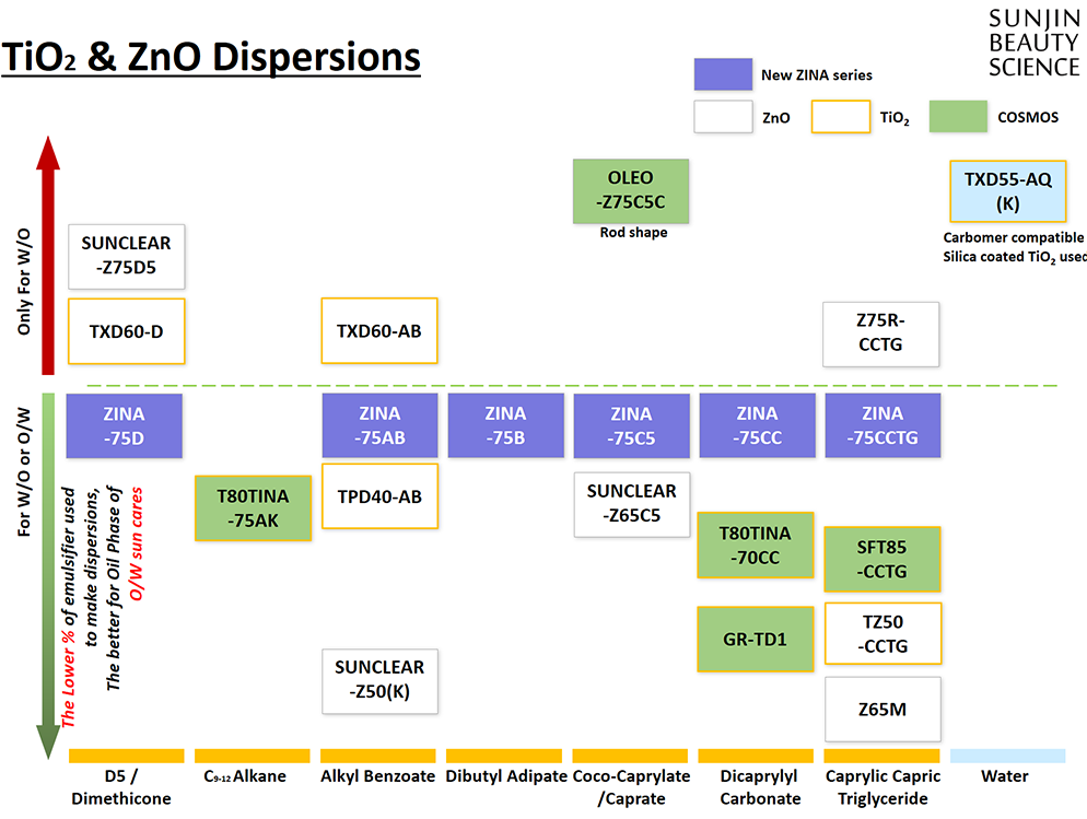 고객사의 니즈에 따라, Zinc Oxide 와 Titanium Dioxide의 다양한 유분산액과 수분산액을 제공하고 있습니다.