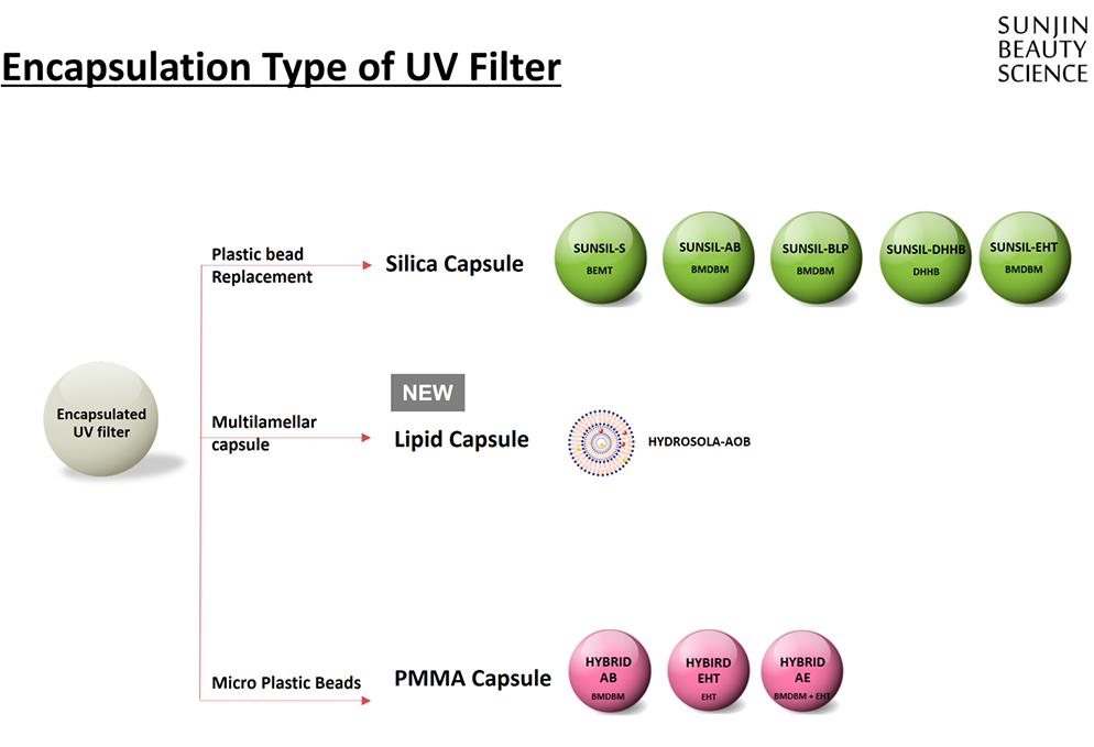 최근 선케어 제품의 트랜드는 High SPF, High PA를 선호하는 추세가 뚜렷합니다. 이러한 효능을 내기 위하여는 다량의 UV filter를 유상에 사용하여 제형 개발을 해야 하는데, 대부분의 유기 자외선 차단제는 유상에 사용되며 용해도가 높지 않다는 단점이 있습니다. 이런 문제를 해결하기 위해 선진뷰티사이언스는 수상과 유상 모두에 사용할 수 있는 독창적인 UV Capsule을 개발하였습니다.
