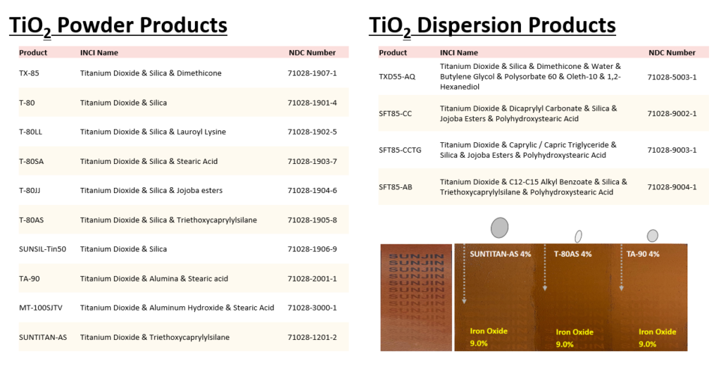 현재 TiO2, ZnO 파우더 및 분산액 제품에 대한 NDC 번호를 보유하고 있으며, 아래 목록에서 제품별 NDC 번호 확인하실 수 있습니다.