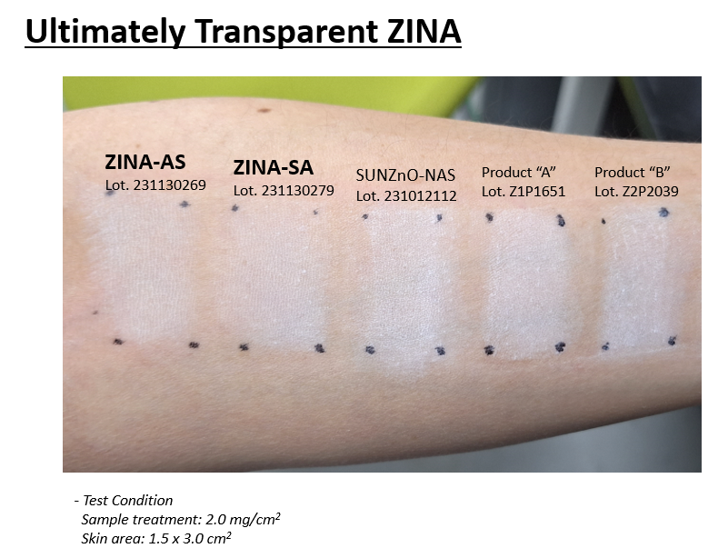 Alkyl Silane 코팅의 ZINA-AS, Stearic Acid 코팅의 ZINA-SA 두 가지 버전이 있으며, 균일한 사이즈의 ZnO를 통해 자사/타사 제품과 비교해보았을 때에도 극강의 투명함을 보이는 제품입니다.