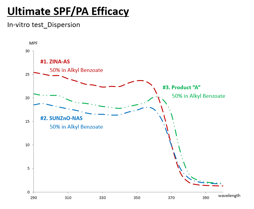 ZINA 시리즈의 또 다른 장점은 높은 자외선 차단력을 지니고 있다는 점입니다. ZINA-AS를 Alkyl Benzoate에 분산시켜 In-vitro 테스트를 진행한 결과, 눈에 띄는 강력한 자외선 차단력을 나타냈습니다.