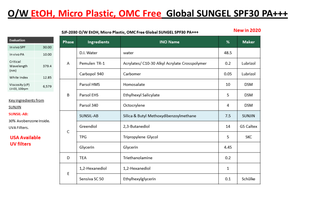 기존의 선젤 처방은 대부분 에탄올을 함유하고 있으나, 선진에서는 SUNSIL-AB라는 자사 원료를 사용하여 에탄올 Free, 클린뷰티컨셉의 처방을 개발하였습니다.