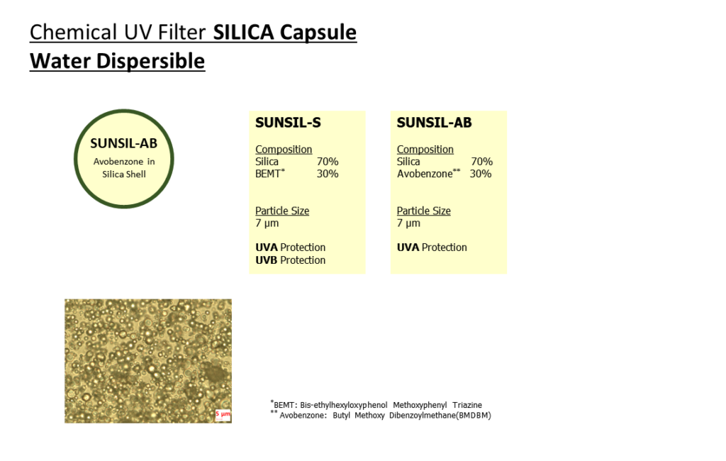 SUNSIL-AB란 유기자외선 차단 성분인 아보벤존을 실리카에 캡슐화 시킨 제품으로, 수상에 사용 가능한 유기 자외선 차단제 입니다.