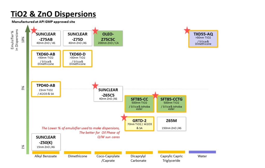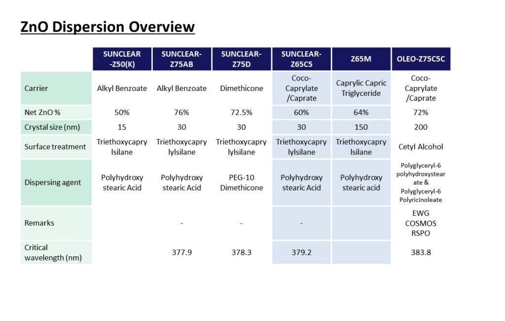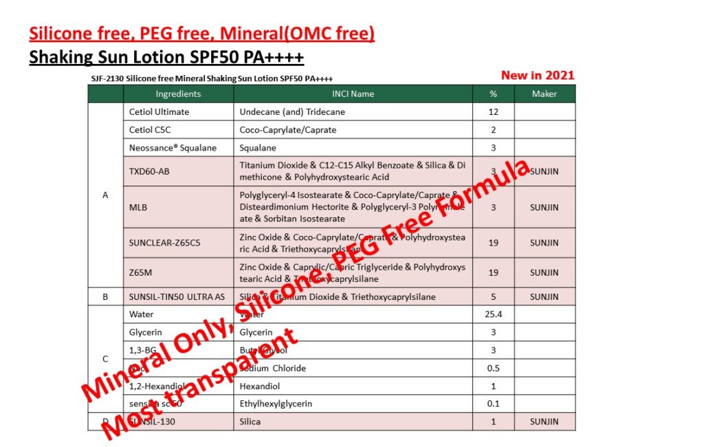 높은 자외선 차단 능력을 나타내면서 투명성이 좋은 처방을 위해 징크옥사이드 분산물인 SUNCLEAR-Z65C5 및 Z65M를 주요 자외선 차단제 성분으로 사용하였습니다.