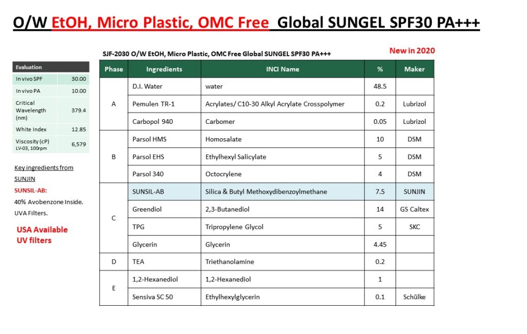 첫번째로 소개해드릴 처방은 SPF30 PA3+ 선젤 처방 입니다. 이 처방은 에탄올 Free,OMC Free이며 미세플라스틱 입자가 함유되어 있지 않은 클린뷰티 컨셉에 알맞은 처방 입니다.