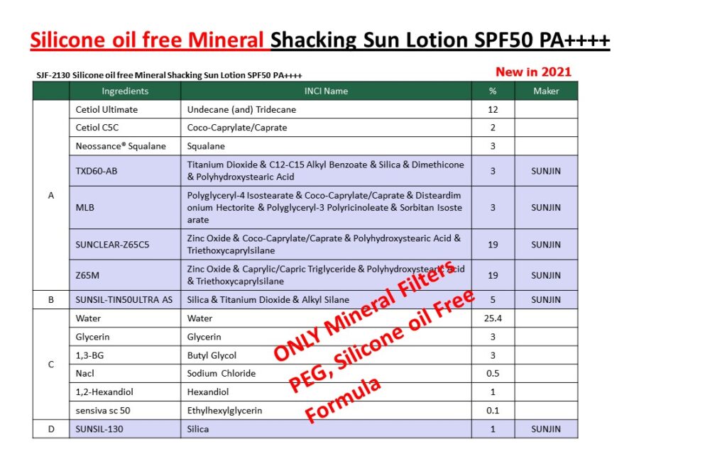 두번째 처방은 쉐이킹 타입의 SPF50 PA4+ 유무기 복합 선밀크 처방 입니다. OMC, PEG, Silicone oil Free이며 투명성이 뛰어난 처방 입니다.
