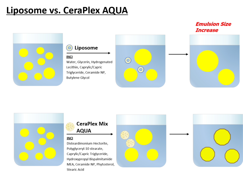 기존의 리포좀을 활용한 세라마이드 처방은 리포좀이 유화액적과 합쳐져 유화액적이 커지기 때문에 불안정해질 가능성이 있습니다. 그에 반해 Ceraplex AQUA를 사용하면 Ceraplex AQUA의 헥토라이트가 유화액적 주위를 감싸주어 더욱 안정한 처방을 만들 수 있습니다.
