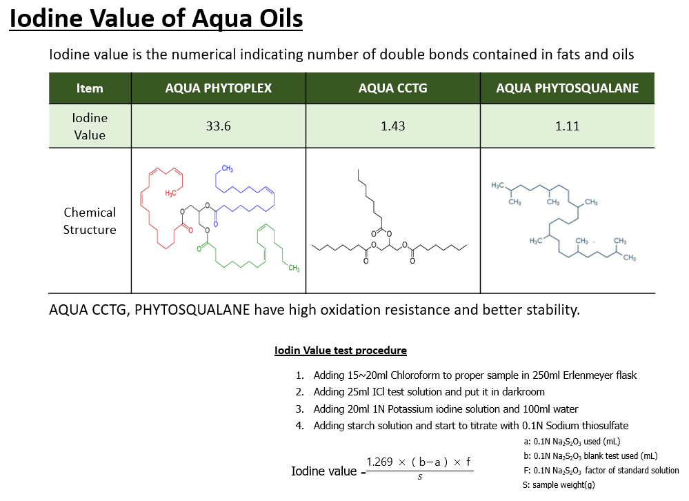 또한 AQUA CCTG 및 AQUA PHYTOSQUALANE은 요요드 값이 낮아 다른 AQUA Oil 시리즈에 비해 산화에 대한 위험이 적으며 처방시 안정합니다.