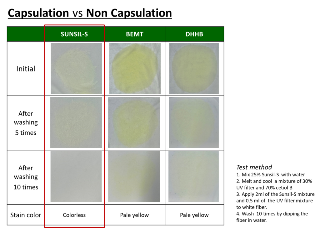 일반 BEMT나 DHHB는 옷에 노란 얼룩을 남기기 쉽고 여러 번 세탁해도 잘 지워지지 않지만, SUNSIL-S는 BEMT가 옷감에 직접 묻지 않기 때문에 얼룩이 남지 않아 세탁이 쉽습니다.