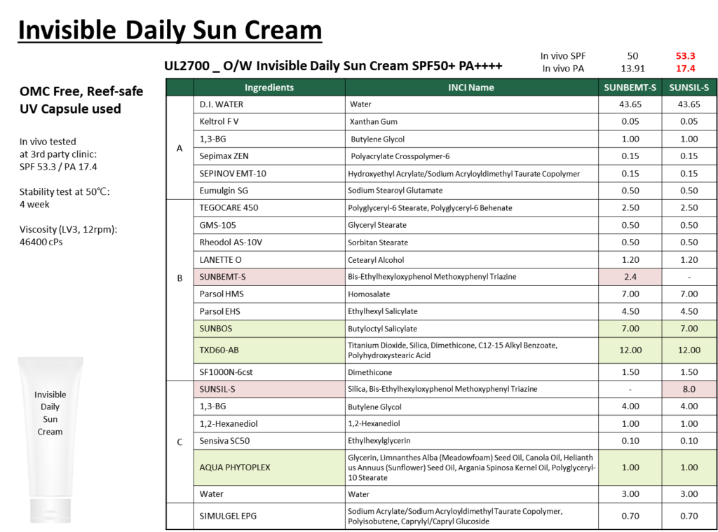 이번 호에서는 올해 새롭게 출시한 실리카 캡슐 제품, SUNSIL-S를 사용하여 끈적이지 않는 가벼운 사용감이 특징인 O/W 혼합자차 처방, Invisible Daily Sun Cream을 소개해드리겠습니다.
