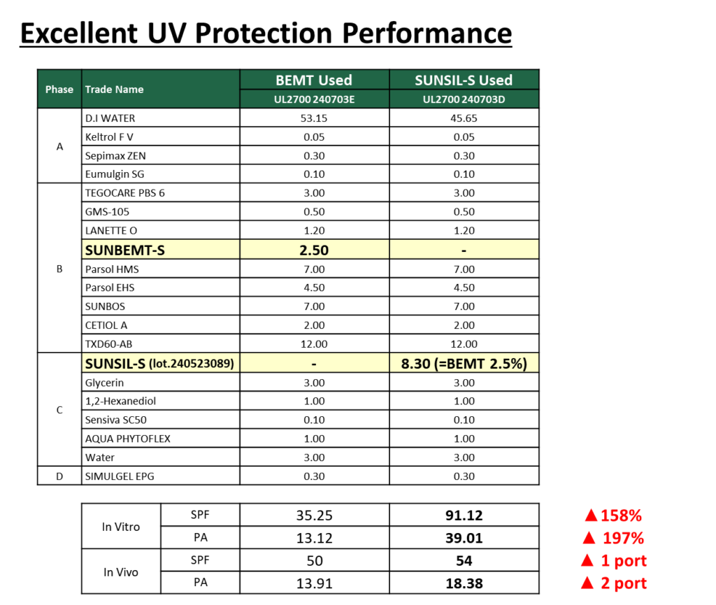 동일한 Net 함량의 BEMT를 처방에 사용하였을 때 보다 SUNSIL-S를 사용하였을 때, 자외선 차단력이 더욱 증가하였습니다. (SPF50 PA13.91 -> SPF 53.3 PA17.4) 또한 실리카 캡슐 제품을 사용함으로써 선크림의 끈적이는 사용감을 보다 효과적으로 개선 할 수 있습니다.