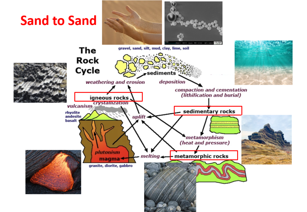 바다에 가라앉은 실리카는 퇴적되면서 오랜 시간에 걸쳐 퇴적암을 형성합니다. 이후 열과 압력을 받아 변성암으로 변하고, 마그마 용융 과정을 거쳐 화성암이 됩니다. 이렇게 생성된 화성암이 다시 지표로 분출하면서 실리카가 새롭게 생성되는 순환 과정을 밟게 됩니다. 이러한 암석의 생성과 순환을 암석의 순환(Rock Cycle)이라고 합니다.