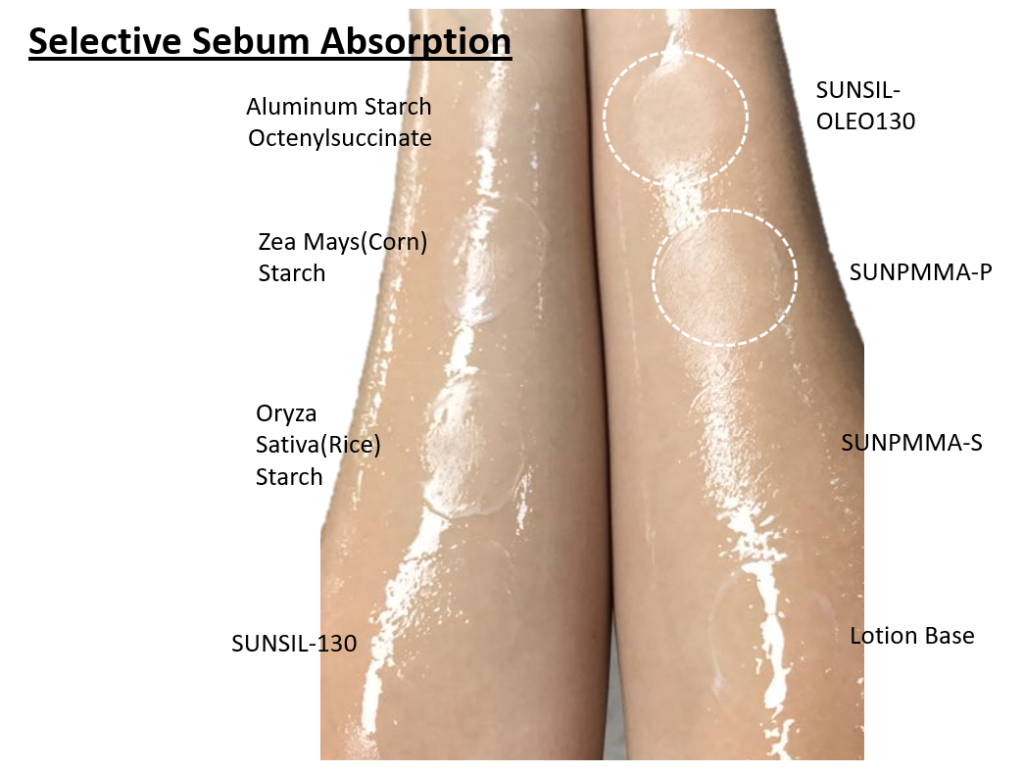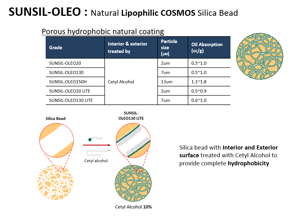 SUNSIL-OLEO 시리즈는 자연 유래 원료인 실리카에 Cetyl Alcohol을 외부 뿐만 아니라 내부에도 처리하여 친유성인 특징을 가진 원료입니다. Cetyl Alcohol로 처리하였기 때문에 기존 실리카의 사용감과 다르게 훨씬 부드러운 사용감을 가지고 있습니다.