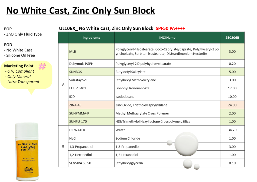 이 징크 온리 선크림 처방은 ZINA-AS를 24% 사용하여 SPF50, PA4+의 투명하고 강력한 자외선 차단 효과를 제공하며, 뛰어난 분산성과 사용 편의성을 자랑하여, 변화하는 시장의 요구를 완벽하게 충족시킵니다.
