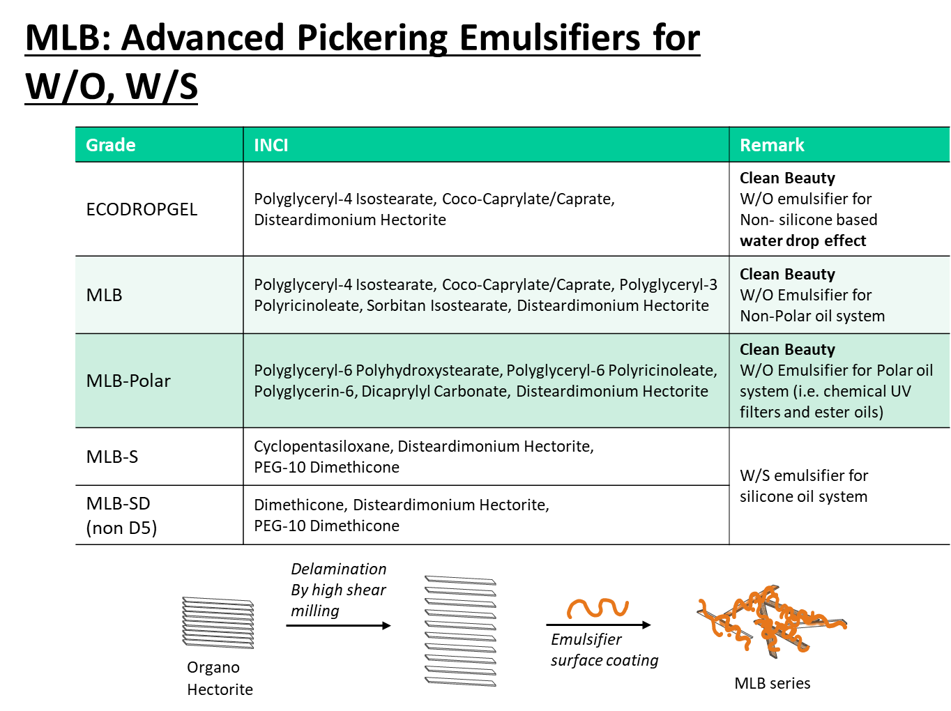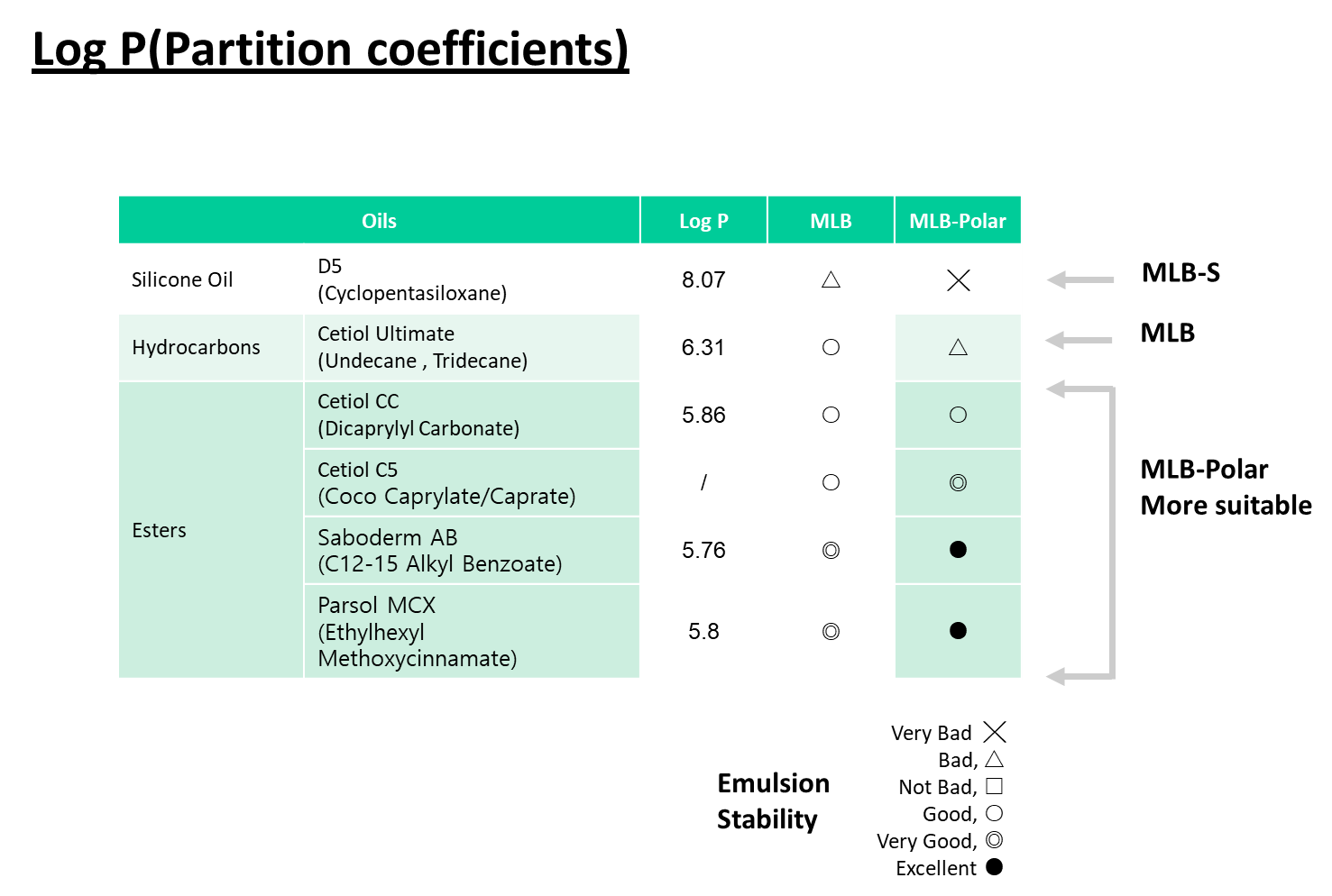 사용하시려는 오일의 종류와 극성도(Log P)에 맞춰 최적의 MLB 시리즈를 선택해보세요. 실리콘 오일(비극성)부터 에스터 오일(극성)까지 완벽하게 커버합니다. MLB 시리즈 중에서도 특히 MLB-Polar는 안정한 유화상을 만들기 까다로운 유기 자외선 차단제 및 에스터(Ester) 오일 기반 처방에 특화된 제품입니다.