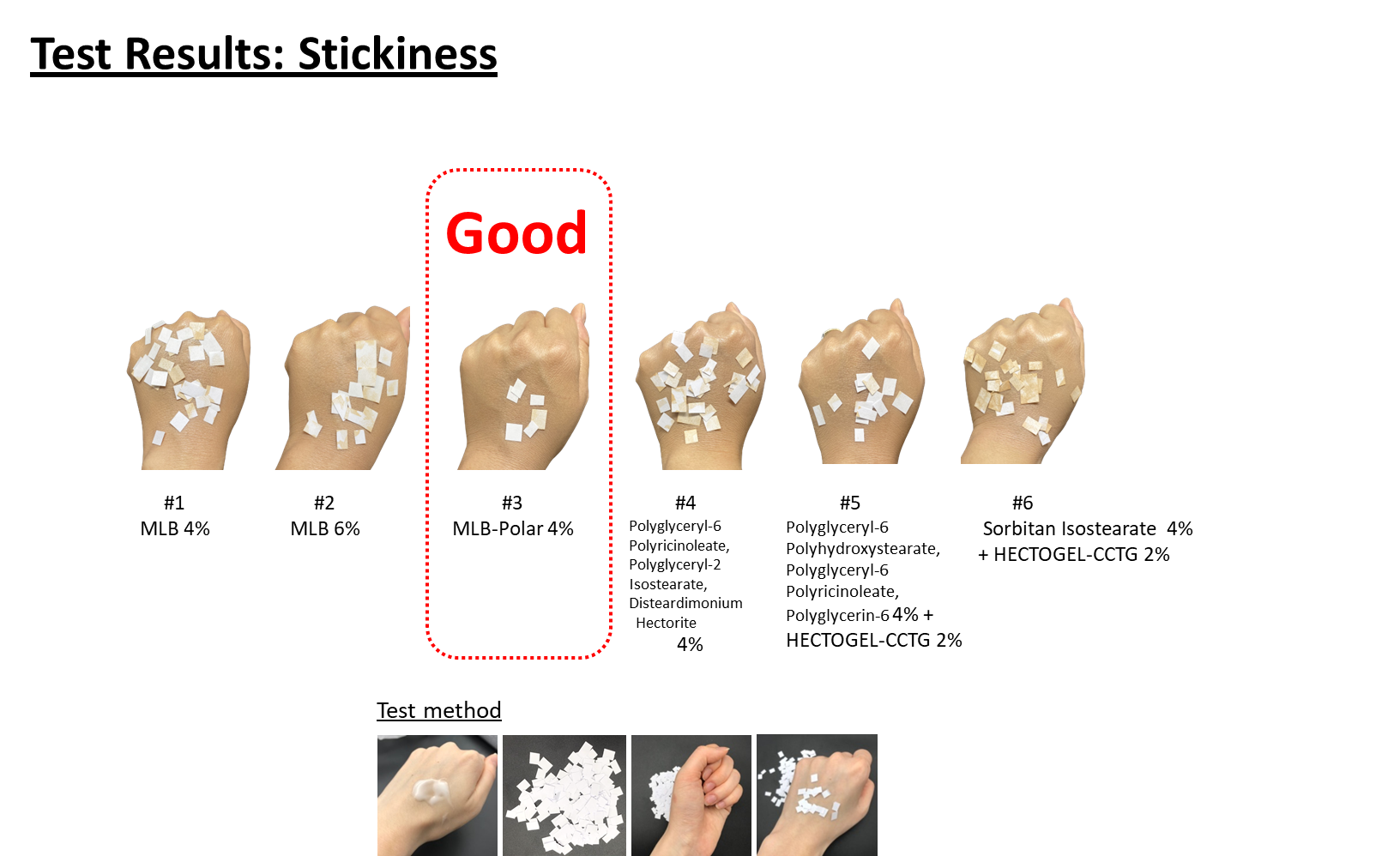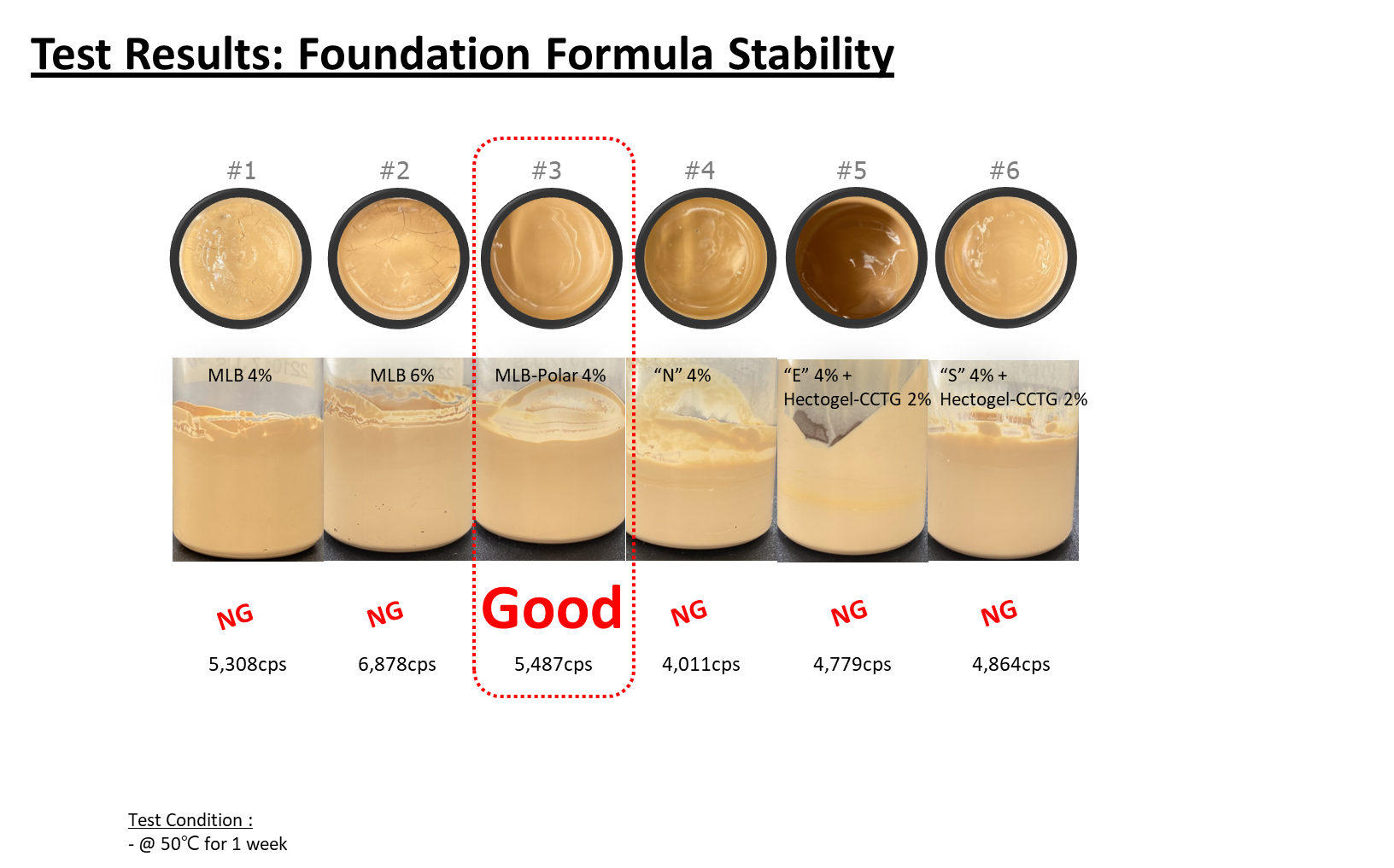 자사 연구소에서 진행한 파운데이션 처방 비교 실험 결과, MLB 시리즈의 기술적 우수성이 입증되었습니다. 점증제를 별도로 첨가하지 않고 MLB-Polar를 단독으로 4%만 사용한 처방(#3)이 타사 유화제와 점증제를 혼합한 처방(#5 or 6)보다 제형 분리 없이 가장 안정적인 결과를 나타냈습니다.