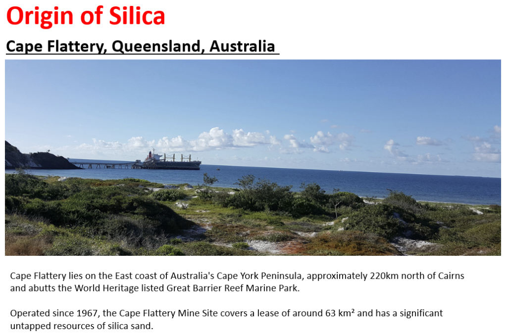 선진뷰티사이언스의 실리카는 호주 Cape Flattery Silica Sand Mine의 규사를 사용하여 제조 됩니다. 이 광산은 1967년부터 운영되어 왔으며, 약 63km²의 면적으로 이루어져 아직 개발되지 않은 상당량의 규사 자원을 보유하고 있습니다. 따라서 앞으로 100년 동안 사용할 수 있는 규사가 충분합니다.