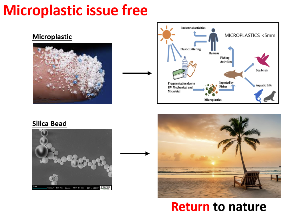 실리카는 미세플라스틱과 달리 자연으로 돌아갈 수 있는 친환경적인 원료입니다. 미세플라스틱은 바다로 흘러 들어가 해양생태계를 파괴하지만, 실리카는 자연에서 생성된 물질이기 때문에 해양생태계에 피해를 주지 않습니다.