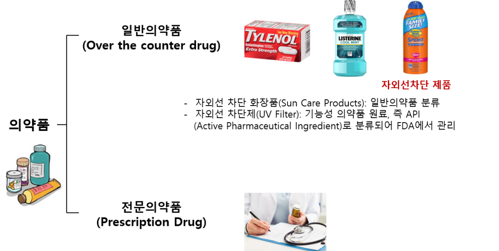 미국에서 자외선 차단 화장품은 일반의약품(Over-the-counter, OTC drug)로 전문의의 처방전 없이 구입할 수 있는 의약외품 입니다. 따라서 자외선 차단 원료는 기능성 의약품(API, Active Pharmaceutical Ingredient)으로 분류되어 FDA의 관리를 받게 됩니다.