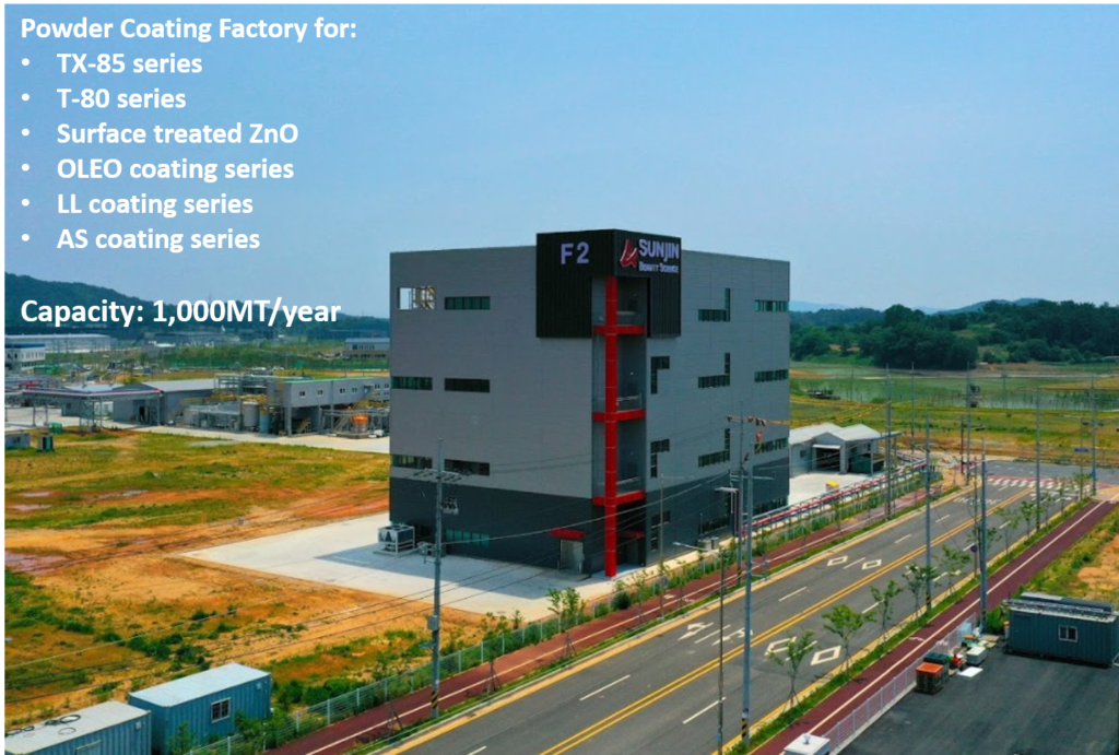총 공사비용 73억 원이 투입된 장항 제2공장의 연간 생산규모는 약 1,000톤이며, 무기계 자외선 차단제인 TiO2 및 ZnO를 포함한 다양한 표면 처리 제품을 생산 할 예정입니다.