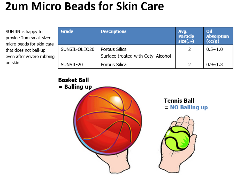 따라서, 스킨케어 처방에는 때밀림 현상을 피하기 위하여 2um 사이즈인 SUNSIL-20과 SUNSIL-OLEO20을 추천 드립니다.