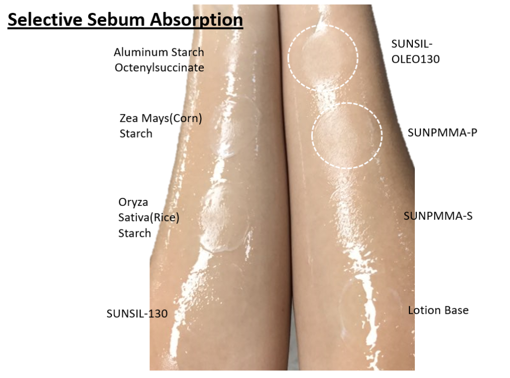 그 외에도 친유성인 SUNSIL-OLEO 시리즈의 빠른 흡수, 점증제와의 호환성, 부드러운 발림성, 뭉침 현상 없음과같은 대표적인 장점들은 스킨 케어용으로 사용하기에 아주 적합하다는 것을 알 수 있습니다.