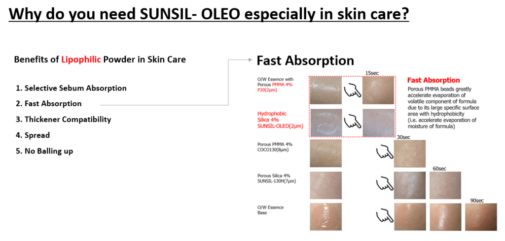 SUNSIL-OLEO 시리즈는 자연 유래 원료인 실리카에 Cetyl Alcohol을 외부와 내부에 모두 처리하여 친유성인 동시에 흡유성을 띄고 있습니다.