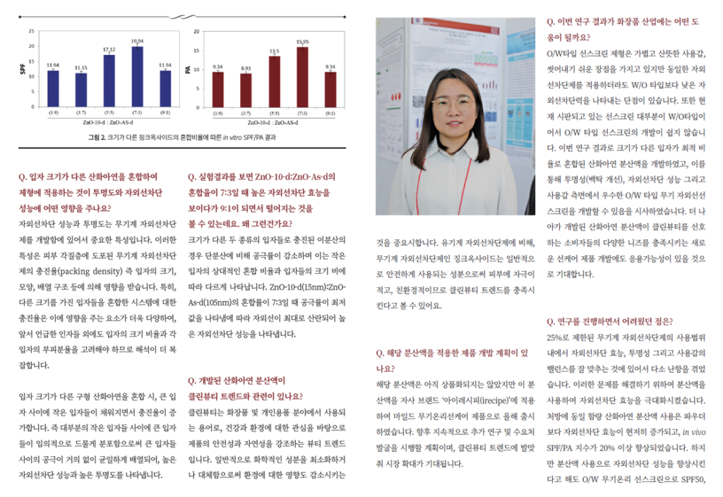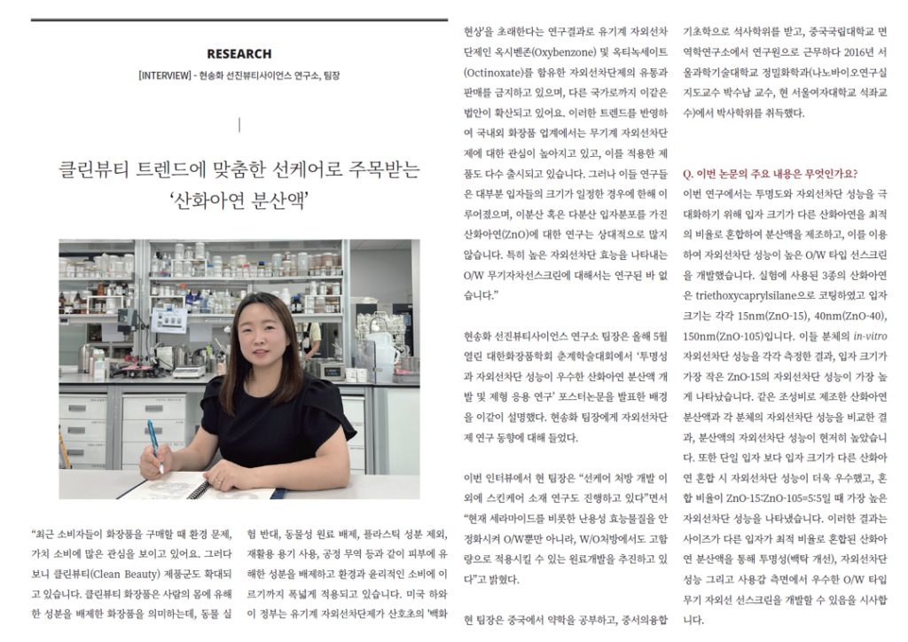 한국 화장품 전문 매거진 THE K BEAUTY SCIENCE 23년 9월호에 선진뷰티사이언스 연구소 현송화 팀장의 “클린뷰티 트렌드에 맞춤한 선케어로 주목받는 ‘산화아연 분산액’ ”이라는 인터뷰가 실렸습니다.