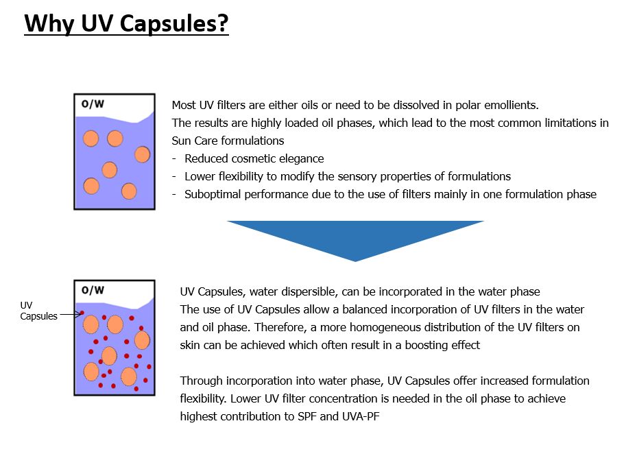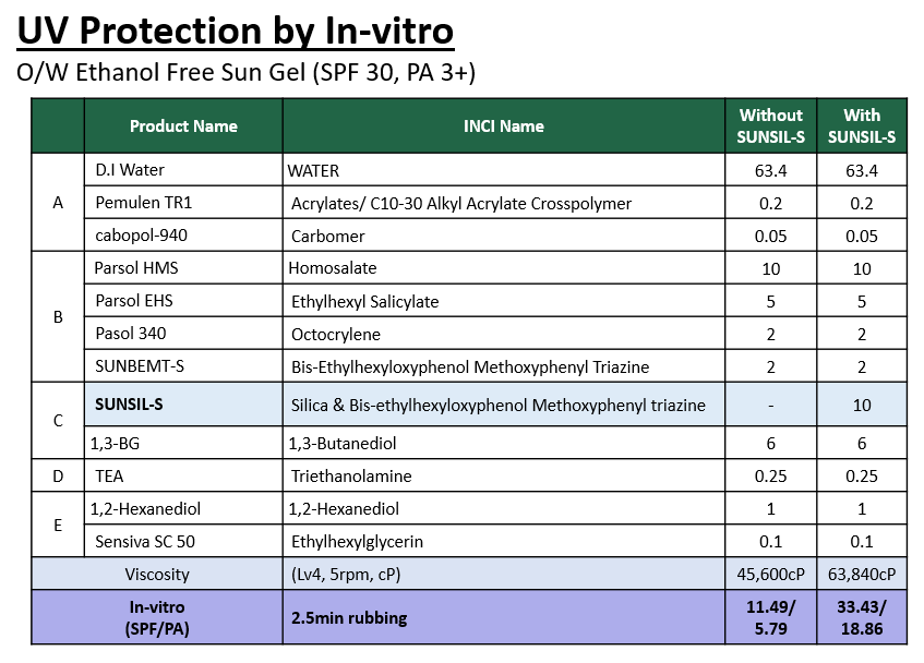 이번 호에서는 일반적으로 유상에 사용하는 유기자외선차단제(BEMT)를 수상에 사용하여 가벼운 사용감&높은 자외선 차단력을 가진 처방을 제작할 수 있는 실리카 캡슐 제품, SUNSIL-S를 소개해드리겠습니다.