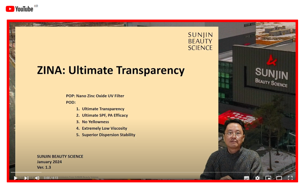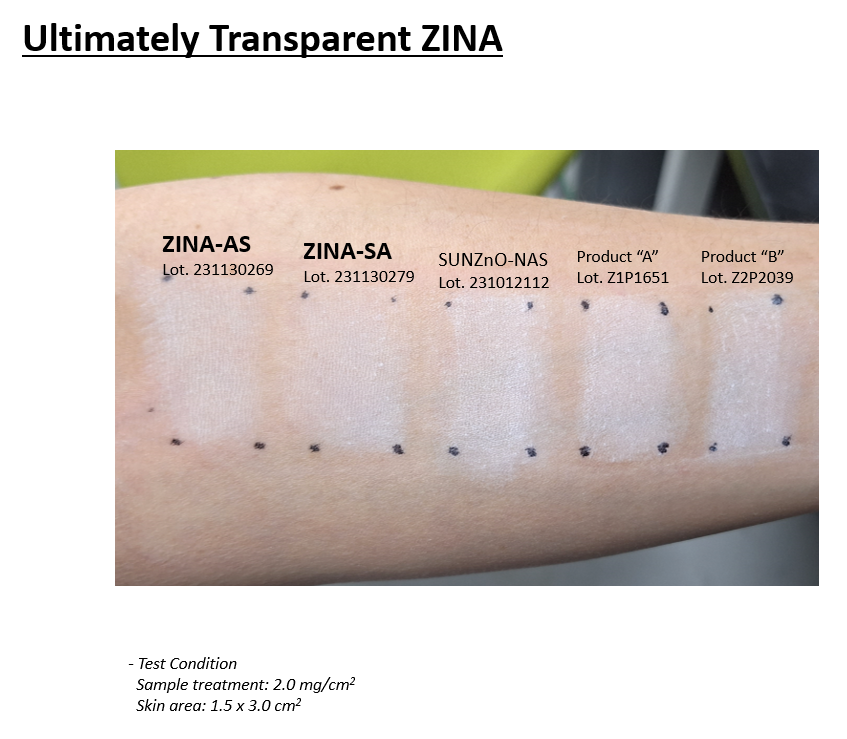 ZINA 시리즈는 코팅제에 따라 Alkyl Silane 코팅의 ZINA-AS, Stearic Acid 코팅의 ZINA-SA 두가지 버전으로 출시가 됩니다. 또한, ZINA 시리즈는 기존에 판매되던 SUNZnO-NAS 및 타사 ZnO와 비교했을 때 월등히 투명합니다.