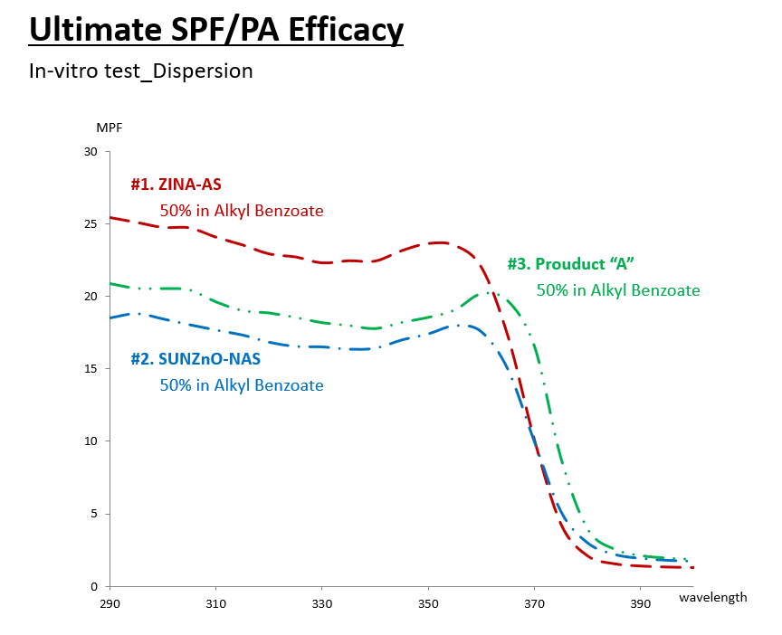 또한, ZINA 시리즈는 높은 자외선 차단력을 가지고 있습니다. Alkyl Benzoate에 분산시켜 in-vitro 테스트를 진행한 결과, SUNZnO-NAS 및 타사 ZnO 제품에 비해서 더욱 강력한 자외선 차단력을 나타냈습니다.