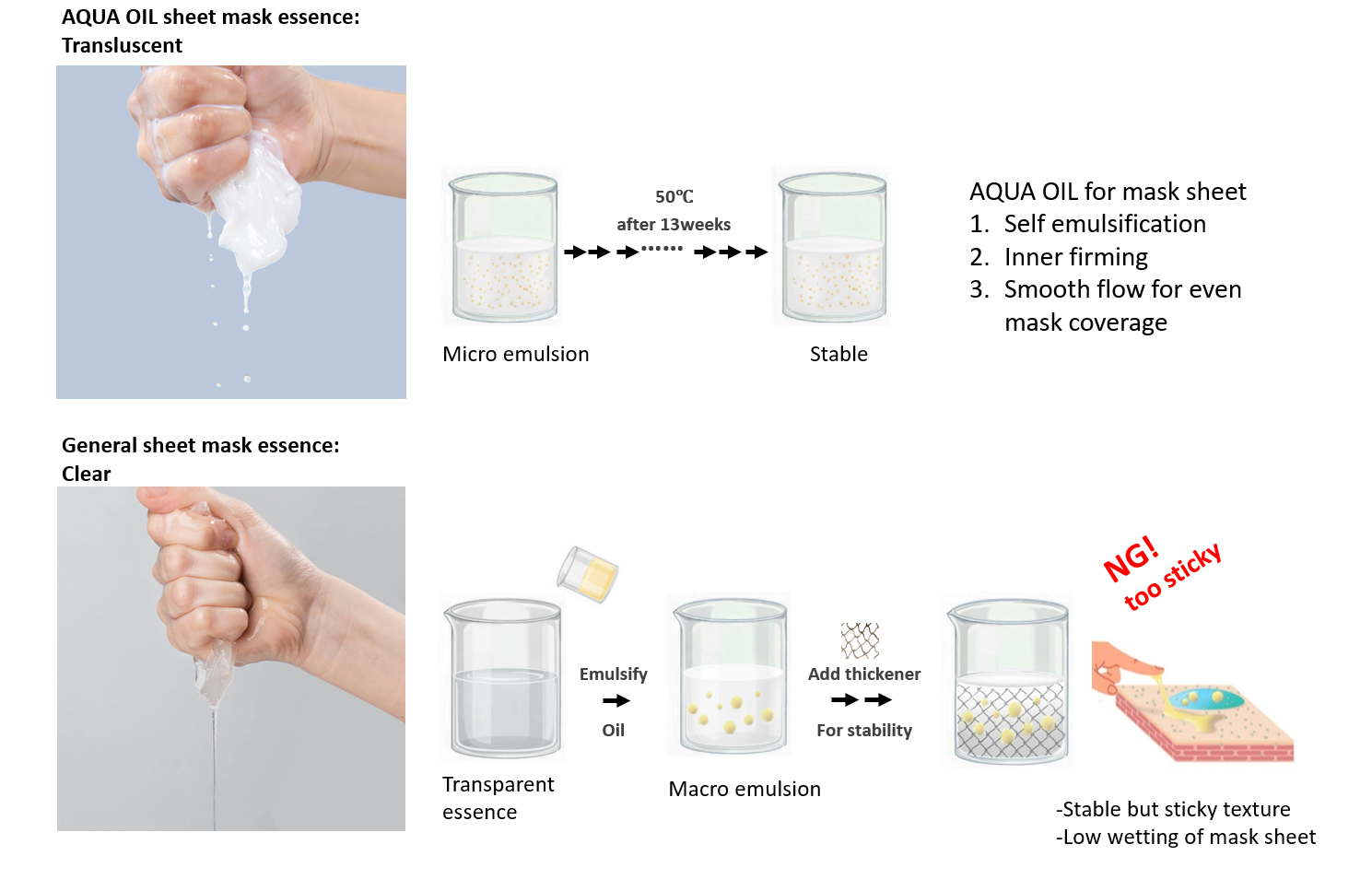 기존 오일을 적용한 시트 마스크의 경우, macro-emulsion 구조로 인해 입자 크기가 크고 안정성 확보를 위해 점증제 사용이 필수적입니다.
