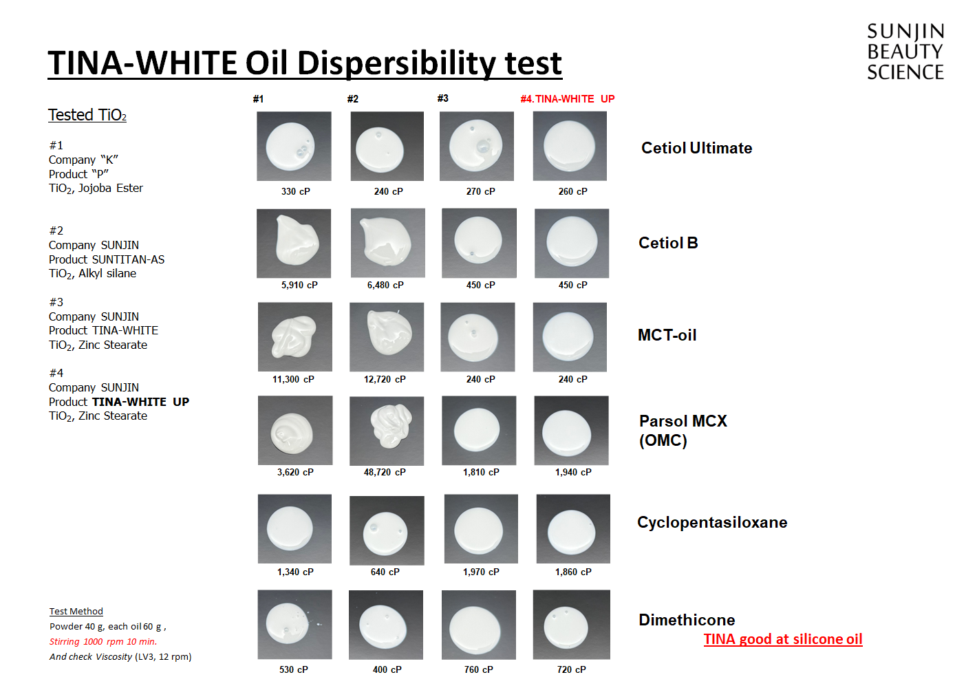 - Low Viscosity: 저점도 제형(에어 쿠션 등)에서도 뭉침 없는 부드러운 발림성