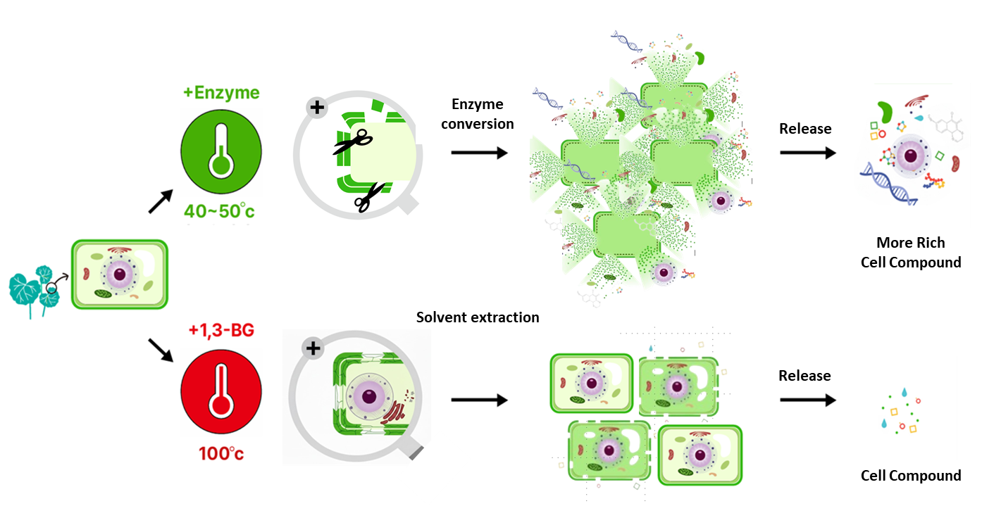 열이나 용매가 아닌 효소에 의해 세포벽을 가수 분해함으로써, 유효 성분 손실은 최소화하고 추출 효율은 극대화한 차별화된 공정입니다.